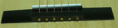 На поверхности верхней деки прикреплена (обычно приклеена или дополнительно закреплена саморезами) подставка для струн (бридж, кобылка, подструнник).